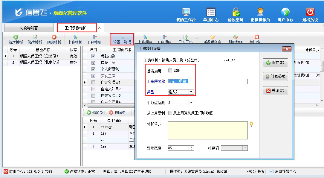 工資模板維護(可以新增多個工資模板,支持自定義工資項和自定義工資計算公式)