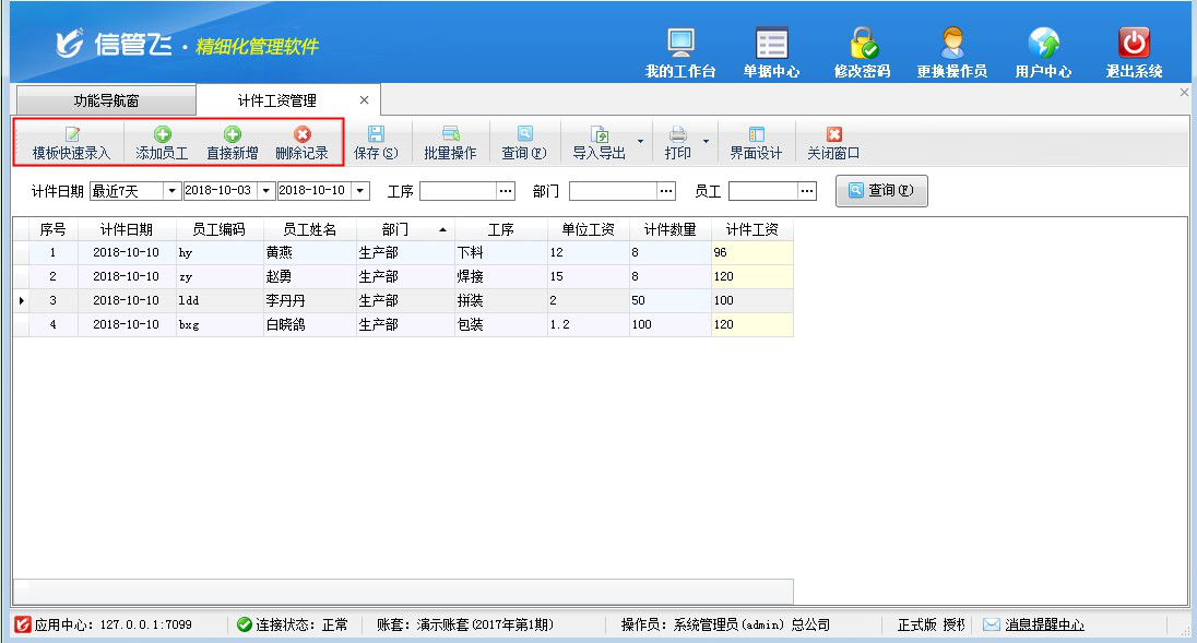 計件工資管理,可以快速錄入計件模板內容或直接新增員工計件工資