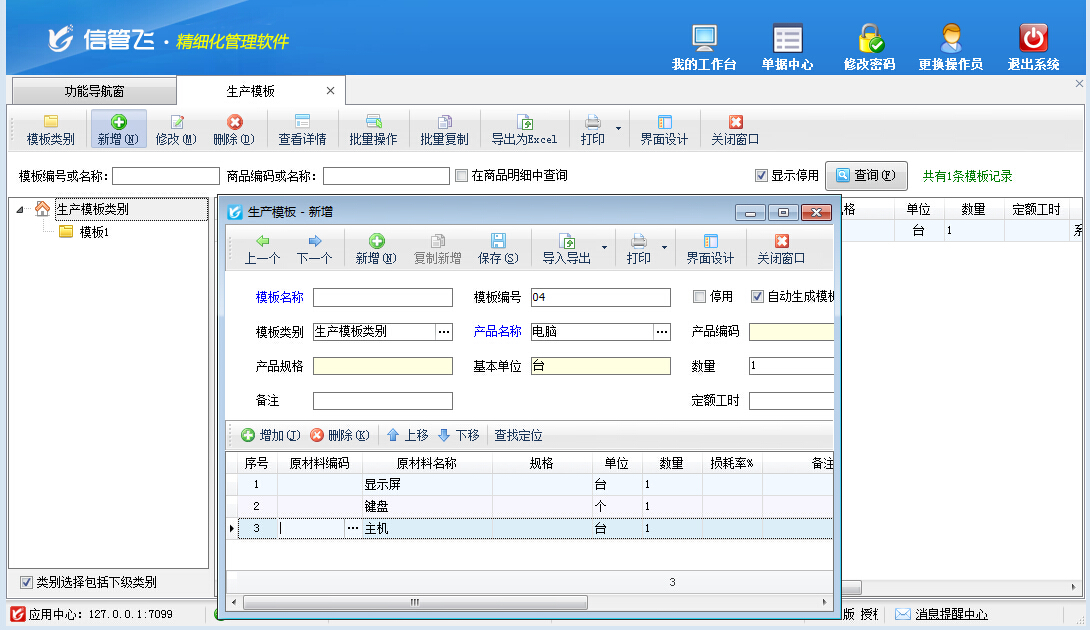 生產(chǎn)模板,即BOM清單(物料清單),可配置每生產(chǎn)一個(gè)標(biāo)準(zhǔn)單位的產(chǎn)品產(chǎn)品需要的原材料種類和數(shù)量。