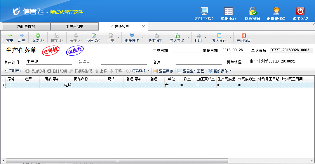 生產(chǎn)任務(wù)單,即生產(chǎn)過(guò)程中的任務(wù)加工單,用于執(zhí)行生產(chǎn)計(jì)劃,進(jìn)入實(shí)際生產(chǎn)階段。