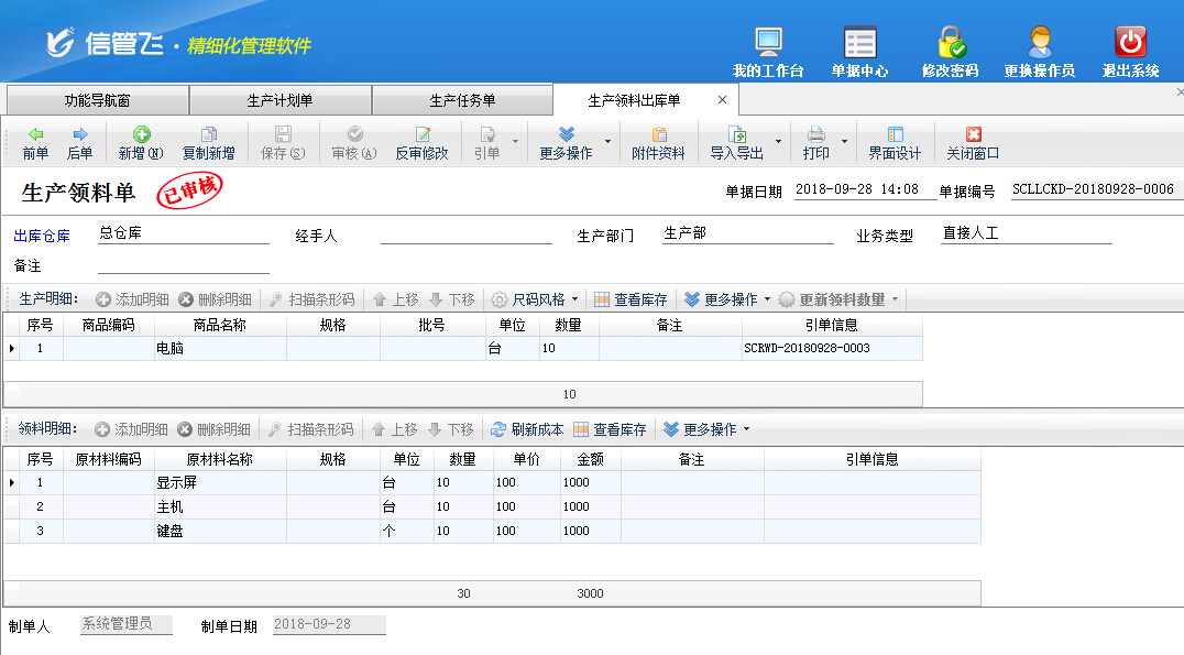 生產(chǎn)領(lǐng)料單,用于原材料的出庫(kù)。生產(chǎn)領(lǐng)料單包括生產(chǎn)產(chǎn)品明細(xì)和領(lǐng)料明細(xì),可根據(jù)“生產(chǎn)模板”自動(dòng)生成需要的原材料明細(xì)。