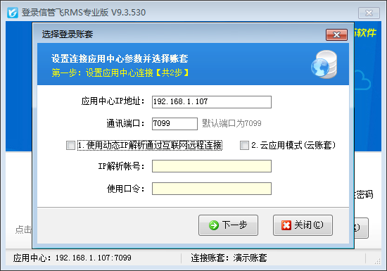 (2)互聯網遠程使用:如果是通過互聯網遠程連接(比如異地使用),軟件支持動態IP解析服務和云應用(云賬套)兩種方式(均為增值服務,需按年付費)。購買后輸入我們提供的IP解析帳號、使用口令或通行證帳號、密碼,然后點“下一步”按鈕,選擇要登錄的賬套。
