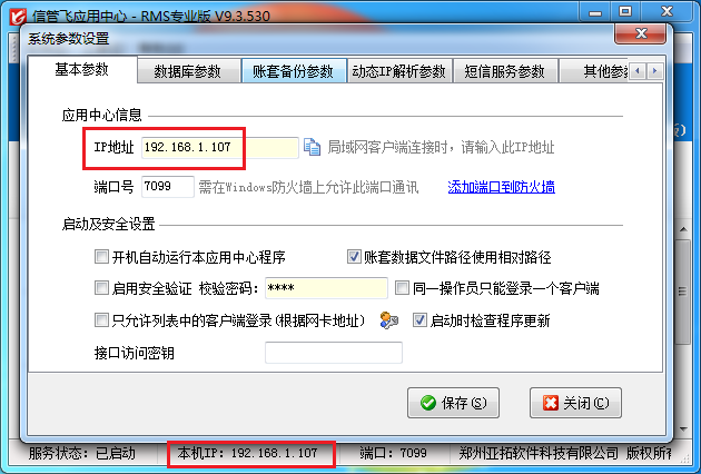????(1)應用中心IP地址即主機電腦的IP地址,可以在主機上的應用中心程序上查看(在狀態欄和系統參數設置中都可以看到),如下圖所示:
