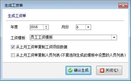 生成工資單:點擊“生成工資單”按鈕,可以彈出生成工資單窗口,在此窗口可以選擇年度、月份及相應的工資模板,然后點擊“確認生成”按鈕即可生成相應的工資單,另外也可以打勾選擇“從上月工資單復制工資項目數據”及“從上月工資單復制人員列表(不復選則生成工資發放模板中設置的相應人員的工資)”選項,打勾復選,本月的工資項目數據則可以復制上月的工資項目數據,不復選則不會復制上月的工資項目數據,如圖所示。