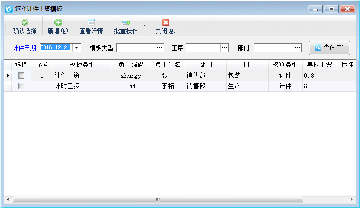 查詢:可以根據模板類型、工序、部門、員工、核算類型等條件進行查詢計件工資模板。
