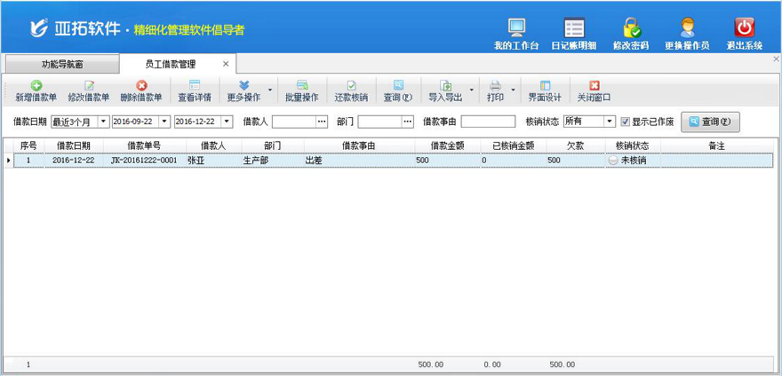????在功能導航窗點擊“綜合管理”—》“員工借款管理”即可進入“員工借款管理”界面,如下圖所示: