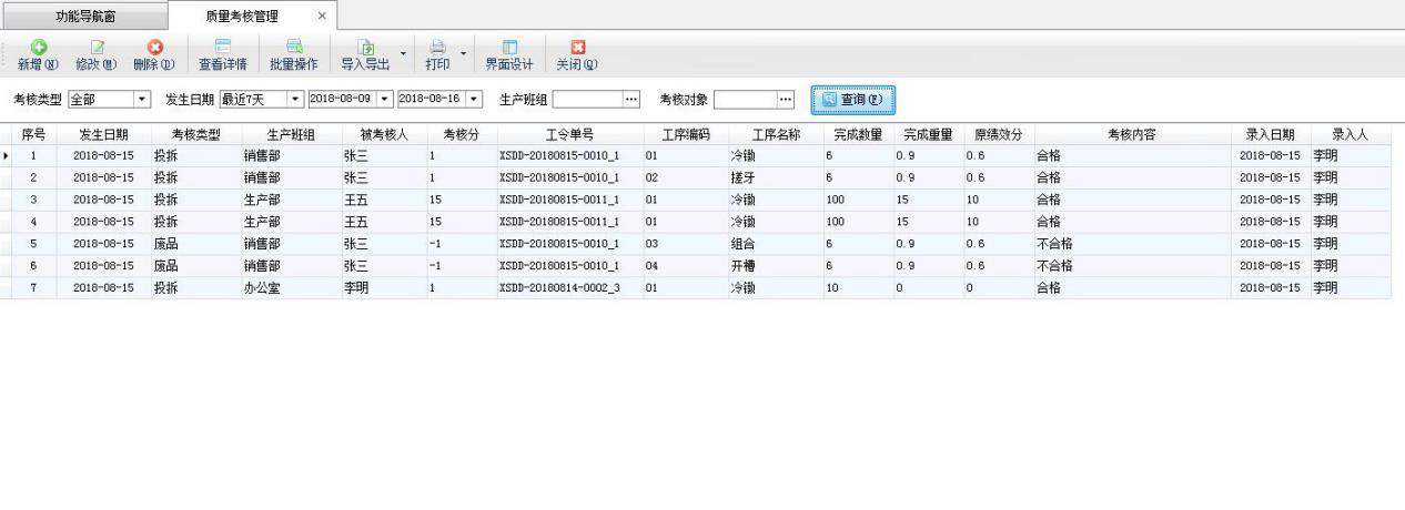 查詢:可以根據考核類型、發生日期、生產班組、考核對象等條件查詢質量考核記錄。