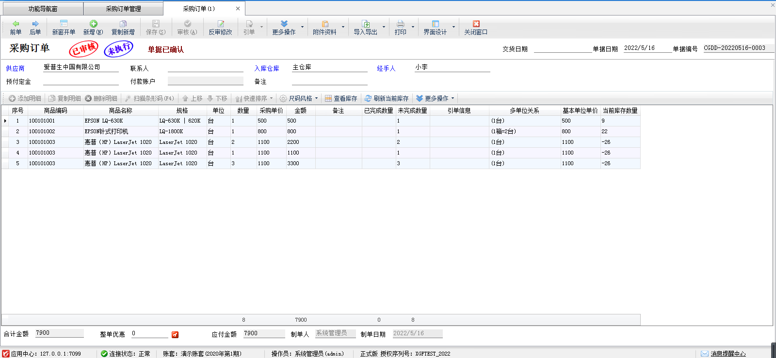 ????采購訂單即采購訂貨意向,采購訂單不影響庫存。采購訂單并非必須使用的功能,如果使用采購訂單功能,可以開“采購入庫單”時,引用(即調取)采購訂單,保存并審核采購入庫單后,軟件會自動更新相應采購訂單中商品明細的已完成(即已收貨)數量和采購訂單的執行狀態。