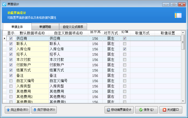 ????② 軟件支持通過界面設計配置單據的數據項,并可調整數據項是否顯示、顯示順序、自定義數據項名稱、顯示寬度、對齊方式、是否必填、取值方式和取值設置等。
