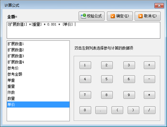 ????雙擊“數據項列表”中的相應數據項,會插入數據項到公式文本框中,點擊數字按鈕和加減乘除按鈕,可以插入符號到公式文本框中。
