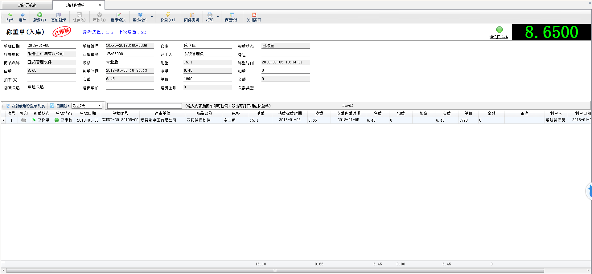 (6)稱重:點工具欄中的“稱重”按鈕,系統可以自動讀取地磅或電子秤上面的稱重數據。