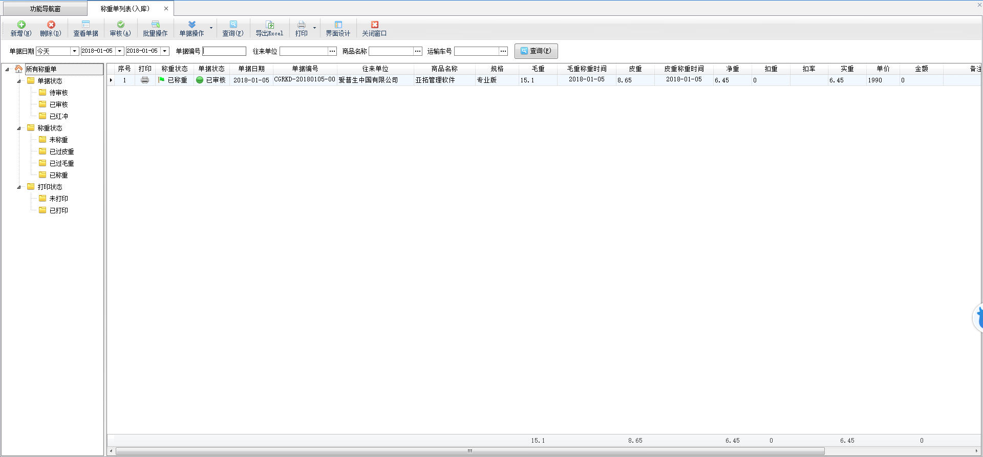 查詢:可以根據單據日期、單據狀態、稱重狀態、打印狀態、單據編號、往來單位、商品名稱、運輸車號等條件查詢業務單據。