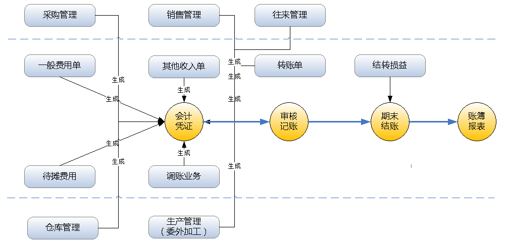 ????專業版及以上版本才有賬務處理功能,賬務處理功能需要操作員具有一定的專業財務知識。軟件提供了大量常見的業務處理功能,填寫相應單據后會自動生成會計憑證,一定程度上減少了使用軟件的難度。財務管理功能的基本操作流程如下圖所示: