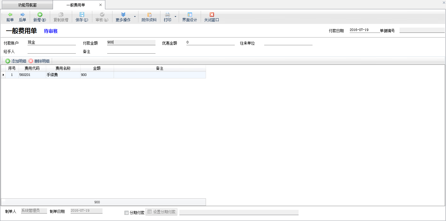 ????一般費用單用于處理銷售費用、管理費用等各類營業外支出,一般費用單會自動生成會計憑證。軟件支持分期付款功能,比如房租可以設置分多少期付款,設置后軟件會自動生成相應的應付款。