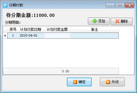 ????點“設置分期付款”按鈕,可以對本次未付款部分,設置分期,每期可設置計劃日期、計劃付款金額等信息,軟件會自動生成相應的應付款記錄。
