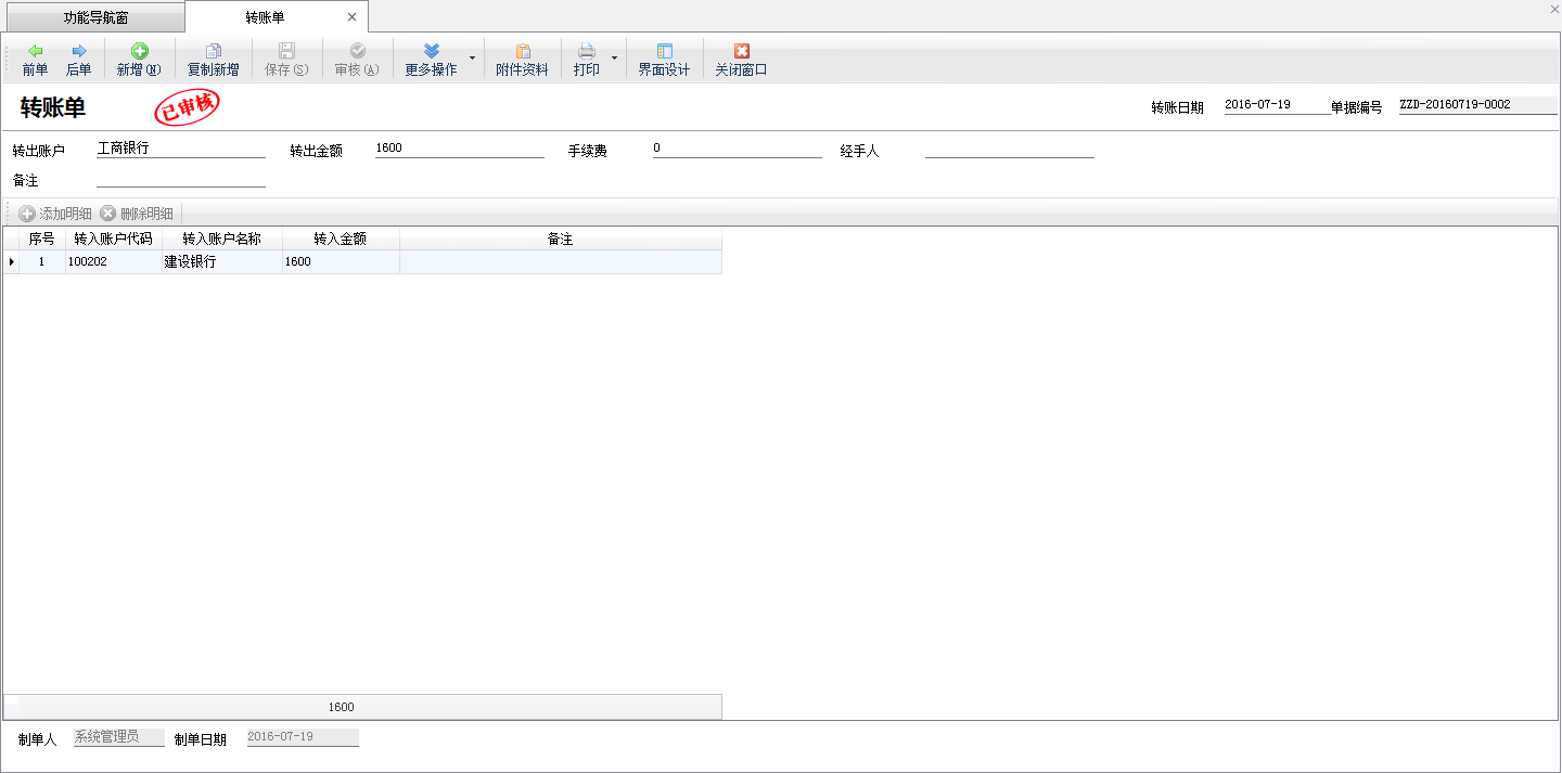 ????在功能導航窗,點“財務處理”—》“轉賬單”,即可進入轉賬單界面,如下圖所示: