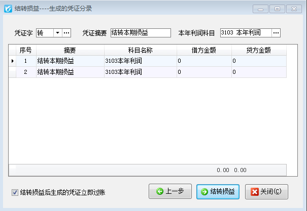 ????點“下一步”按鈕,軟件會自動生成相應的憑證分錄,點“結轉損益”按鈕即可結轉余額到“本年利潤”科目。可以打勾選擇“結轉損益后生成的憑證立即過賬”復選框,則相應的憑證會自動審核過帳。
