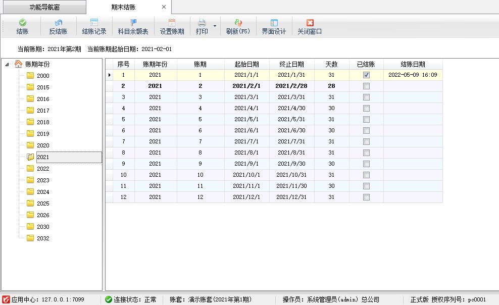 ????③ 期末結賬后,軟件自動進入下一個賬期(月份)。