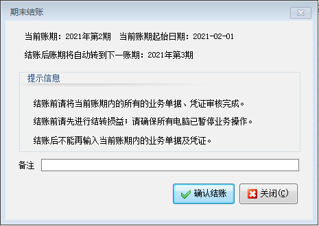 結賬:點“結賬”按鈕,軟件彈出確認窗口,在提示窗口中點“確認結賬”,軟件將執行結賬操作,生成相應的數據。備注中可添加一些提示信息。