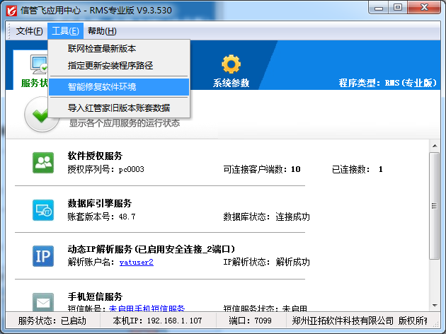 ????在應(yīng)用中心點(diǎn)擊菜單“工具”—》“智能修復(fù)軟件環(huán)境”,然后點(diǎn)“智能修復(fù)”按鈕,軟件會(huì)自動(dòng)重建數(shù)據(jù)庫環(huán)境,并創(chuàng)建桌面快捷方式。