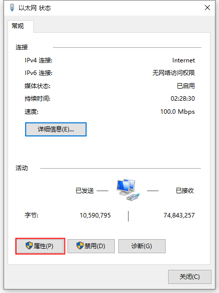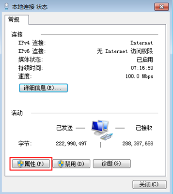 ????③把“網絡連接詳細信息”的界面關閉,回到“本地連接狀態”的界面,如圖所示,點擊“屬性”按鈕,會出現“本地連接屬性”的界面,如圖所示。