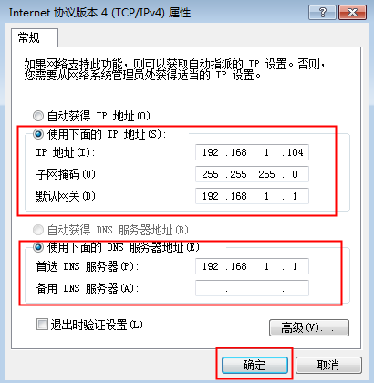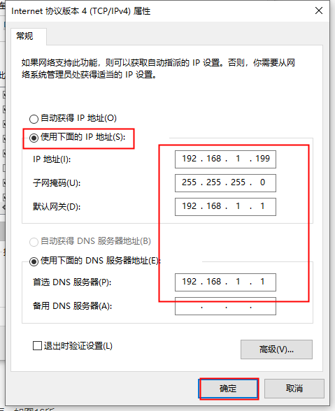 ????注意:此時的IP地址是可以自己設置的,為了避免IP地址沖突,建議在給主機電腦固定IP地址時把IP地址設置的大一些,可改為“192.168.1.199”,子網掩碼、默認網關和DNS服務器信息則不能修改。