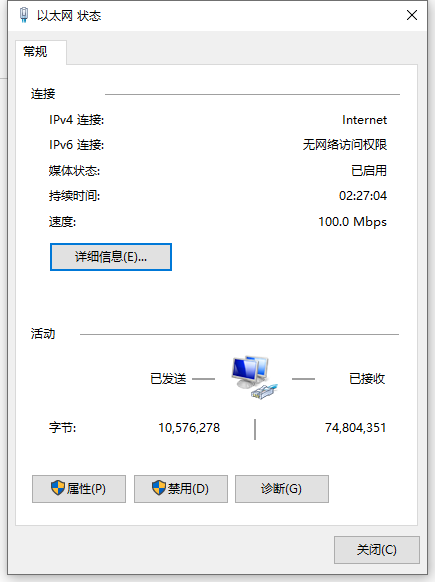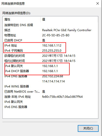 ????②以太網狀態如圖所示,點擊“詳細信息”按鈕,會出現如圖所示的網絡連接詳細信息,此時需要記一下“IPv4地址”、“IPv4子網掩碼”、“IPv4默認網關”和“IPv4 DNS服務器”的信息,后面固定IP地址時需要用到。