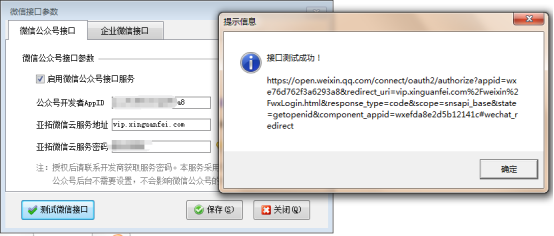 ????在功能導航窗選擇“擴展應用”—》“微信參數設置”,選擇“微信公眾號接口”,啟用并配置相關設置。然后點擊測試微信接口。如下圖所示: