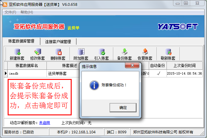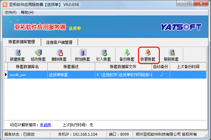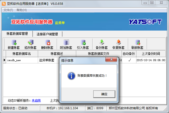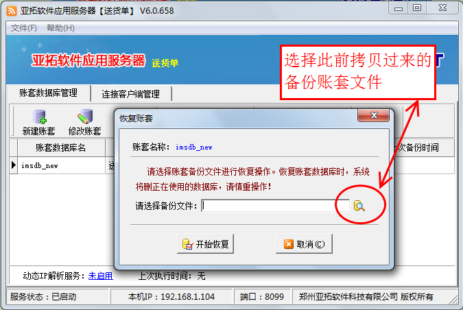 ????在新主機電腦上安裝軟件,打開亞拓軟件應用服務器,然后點擊“新建賬套”,執行新建賬套操作,賬套名為此前備份的賬套名,新建賬套完成后,選擇此新建的賬套,點“恢復賬套”,選擇此前拷貝過來的備份賬套文件進行恢復數據,數據恢復后,在登錄窗口選擇賬套登錄,檢查下數據是否完全恢復。