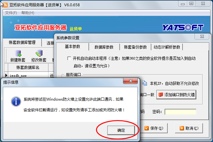 ????主機沒問題后,客戶端電腦有時可能無法連接主機,登錄失敗,此時請固定主機IP地址,另:打開亞拓軟件應用服務器,點“文件”——》“系統參數設置”——》“基本參數”——》“添加端口到防火墻”。(為什么需固定主機IP地址及如何固定IP地址請參見這篇文章:網絡版軟件固定主機IP地址的方法)