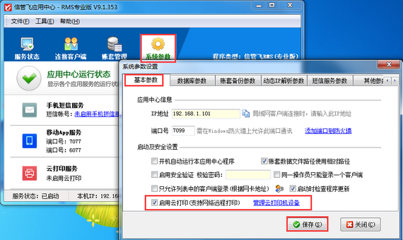 ????云打印機設備設置完成后,登錄軟件,需要設置云打印參數,在功能導航窗點擊“系統管理”->“系統參數設置”->“業務參數”打開業務參數設置窗口,在“打印參數”內打鉤啟用“啟用云打印”參數,然后點擊“保存”按鈕保存設置,如下圖三所示。