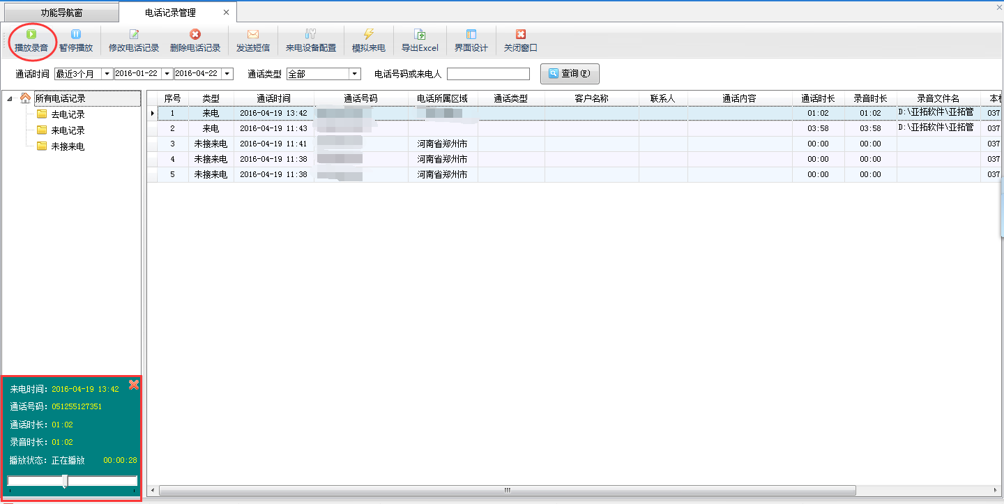 ????在電話記錄管理界面選擇通話時間,輸入來電號碼或者來電人信息查詢即可查詢到我們所需要的來電信息,選擇所需要的來電信息,點擊“播放錄音”按鈕即可播放當前來電的通話自動錄音。