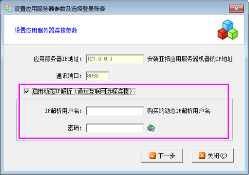 ????打開客戶端登錄界面的“選擇賬套”按鈕,然后勾選“啟用動態IP解析”,填寫IP解析用戶名和密碼,點擊“下一步”,進入選擇賬套的界面,選擇賬套后回到登錄界面,選擇操作員并輸入密碼,進入軟件首頁。