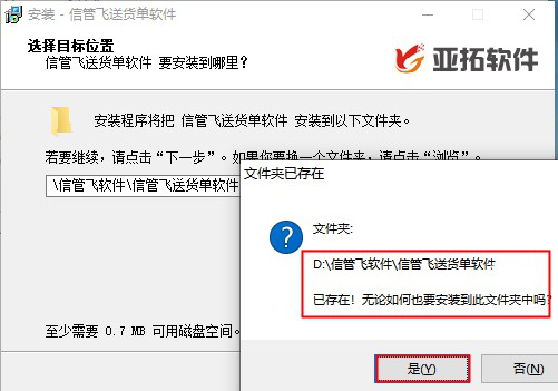 ????刪除后邊重復的內容,點擊下一步,會提示文件夾中已存在軟件,是否繼續安裝在此文件夾,點擊“是”表示覆蓋安裝到之前的文件夾中。如下圖所示: