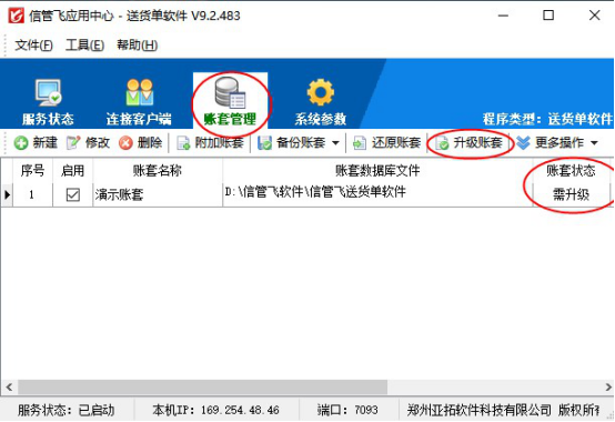????軟件安裝完成后,運行應用中心和客戶端程序,在應用中心界面,選擇賬套管理,顯示之前的所有賬套信息,賬套狀態為“需升級”,在賬套管理界面點擊升級下賬套,升級賬套不影響數據!(也可登錄時直接升級),如下圖所示: