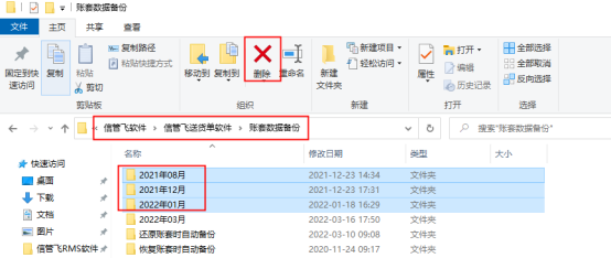 ????打開D盤信管飛軟件—信管飛送貨單軟件—賬套數據備份文件夾(或者桌面圖標鼠標右鍵打開文件位置,快速打開文件所在目錄),可刪除掉除最近日期的所有備份數據,如下圖所示: