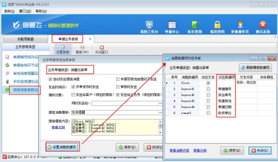 ????模板消息添加完成后,需要設置微信模板消息和軟件數據項的對應。如下圖所示: