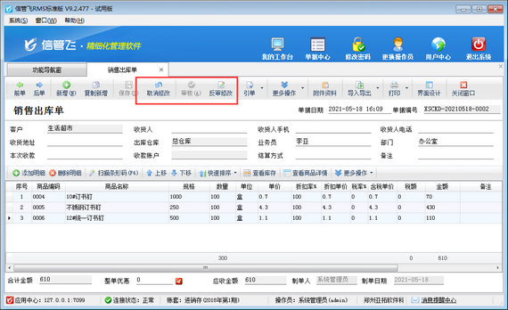 ????信管飛RMS是進銷存一體化的軟件,支持管理往來應收應付款,銷售出庫單審核后自動生成銷售應收款信息,可以對銷售應收款進行收款結(jié)算,如銷售應收款已結(jié)銷的情況下,發(fā)現(xiàn)銷售出庫單有填開錯誤,需要修改,系統(tǒng)默認是不能直接進行反審修改操作,如下圖所示。