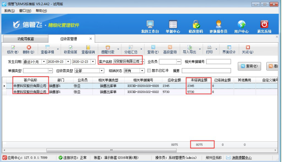 ????參數(shù)設置完成后,功能導航窗點擊“往來管理”—》“應收款管理”可查看所有應收款記錄。選擇示例客戶“中原科貿(mào)股份有限公司”匯總其應收款,可看到有10月兩筆待結(jié)銷應收款記錄。總金額為:8075元,如下圖所示: