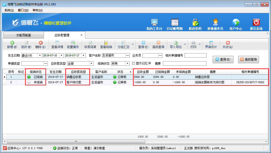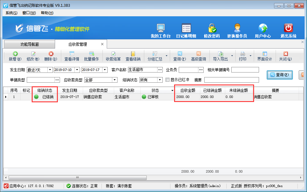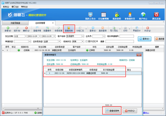 ????收款結(jié)算單單據(jù)審核之后,更新應收款的結(jié)銷狀態(tài),在應收款管理界面可以查看應收款結(jié)銷情況,如下圖所示,客戶“生活超市”應收金額2000元已結(jié)銷,未結(jié)銷金額為0。