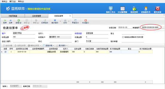 ????在功能導航窗點擊“往來管理”—》“應收款管理”可以查看到當前未結(jié)銷的應收款,選擇示例客戶“亞拓軟件測試”點擊工具欄的“收款結(jié)算”按鈕,會進入收款結(jié)算單界面,如下圖1所示:
