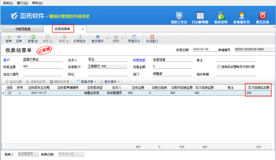 ????如果需要給客戶優(yōu)惠或抹零,可以錄入優(yōu)惠金額,如應收2000元,實際收款1900元,優(yōu)惠了100元,請在收款結(jié)算單單據(jù)主體“收款金額”中錄入1900元,“優(yōu)惠金額”內(nèi)錄入100元,單據(jù)明細中“本次結(jié)銷金額”錄入2000元,保存并審核收款結(jié)算單即可,如下圖所示。