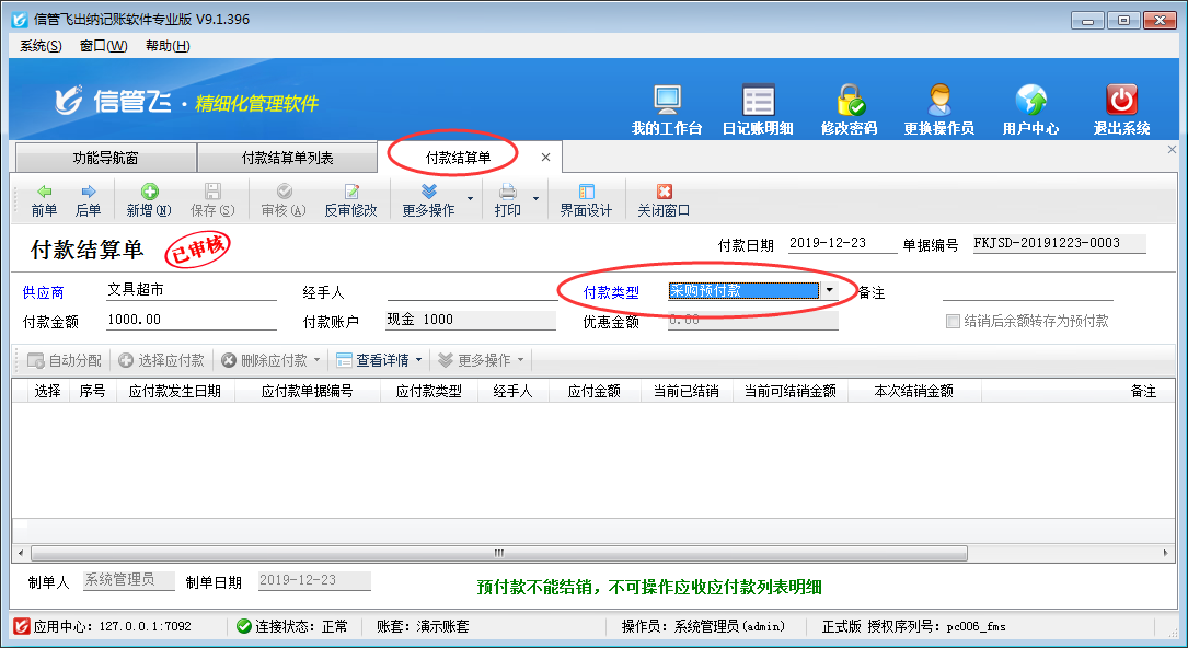 ????信管飛RMS軟件的應付款記錄是根據(jù)開的采購入庫單保存審核后自動生成的,是一一對應的。在功能導航窗點擊“往來管理”—》“應付款管理”可查看單據(jù)生成的應付款記錄,選擇一條未結(jié)銷的應付款,點擊工具欄的“付款結(jié)算”,進行付款結(jié)算操作,如下圖所示: