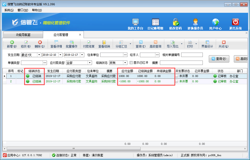 ????應收、應付賬款管理是現(xiàn)代企業(yè)資金管理的重要組成部分,其管理效果的好壞直接影響到企業(yè)經(jīng)營的成敗,信管飛RMS、信管飛出納記賬軟件及信管飛送貨單軟件均支持管理往來賬款,如果應收款結(jié)銷后發(fā)現(xiàn)收款結(jié)銷錯誤,系統(tǒng)支持紅沖并刪除收款記錄,部分用戶在紅沖收款結(jié)算單時會出現(xiàn)如下圖提示:收款結(jié)算單紅沖失敗,當前單據(jù)對應的應收應付款已結(jié)銷,不能紅沖!