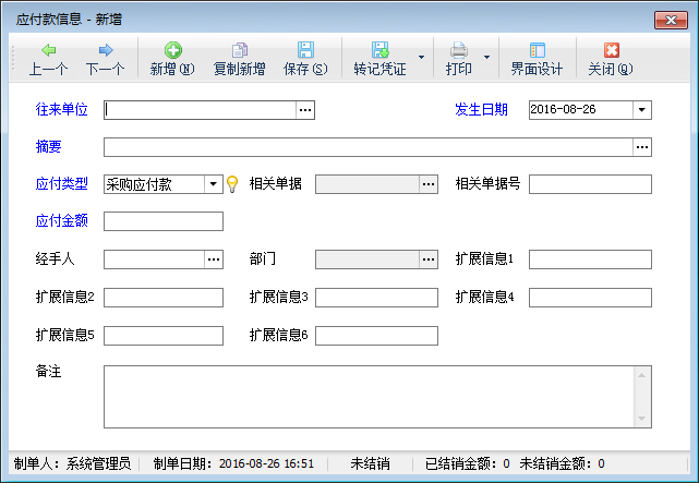 ????在功能導航窗點擊“往來管理”—》“應付款管理”,即可打開應付款管理界面,在工具欄點擊“新增”按鈕,系統(tǒng)打開新增應付款窗口,如下圖所示,“應付類型”選擇為“期初應付款”,然后錄入應付金額及其他數(shù)據(jù)后保存此應付款信息即可。