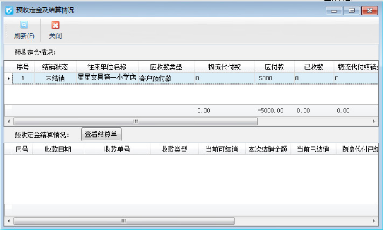 ????在功能導航窗點擊“往來管理”—》“應收款管理”可以打開應收款管理界面,應收款管理是對包括銷售應收款、客戶預付款、銷售退貨應退款、期初應收款等各類應收款項的集中管理。應收款記錄一般由銷售出庫單自動生成,其類型為“銷售應收款”,或者由銷售退貨單自動生成,其類型為“銷售退貨應退款”。在應收款管理中可以查看應收款記錄對應的業(yè)務單據(jù)以及應收款詳細結(jié)銷情況。如下圖所示,客戶“星星文具第一小學店”應收金額為2000元,已結(jié)銷金額為0。
