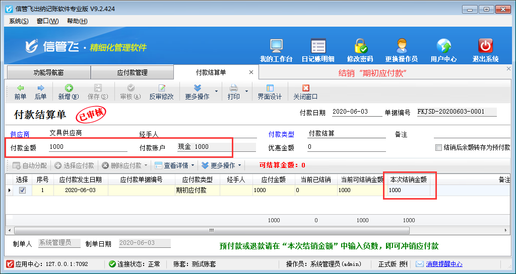 ????保存后,應付款管理界面增加一條未結(jié)銷的期初應付款記錄,后續(xù)給供應商結(jié)款后,可以在軟件中結(jié)銷此期初應付款,選擇此條期初應付款記錄,然后在工具欄點擊“付款結(jié)算”按鈕即可打開付款結(jié)算單界面對期初應付款進行付款結(jié)銷,如下圖所示: