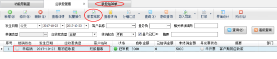 ????在功能導航窗點擊“往來管理”—》“應收款管理”進入應收款管理界面,在應收款管理界面選擇未結(jié)銷的應收款,點擊工具欄的“收款結(jié)算”進行收款操作,如下圖所示: