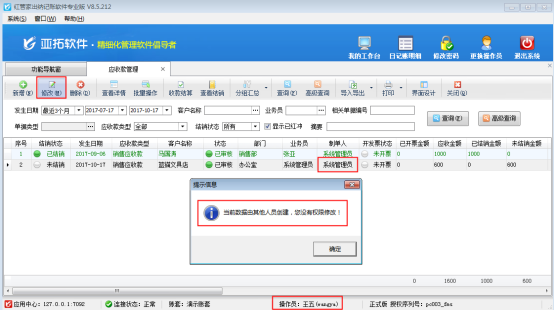????設置完成之后,我們使用操作員“王五”登錄軟件并修改其他人員所錄入的應收款信息時,可以看到系統(tǒng)會彈出提示信息“當前數(shù)據(jù)由其他人員創(chuàng)建,您沒有權(quán)限修改!”,如下圖2所示。