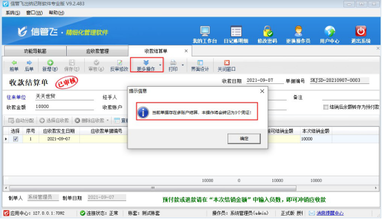 ????收款金額中輸入收款金額,自動分配金額至本次結(jié)銷金額中,勾選“結(jié)銷后余額轉(zhuǎn)存為預付款”,可以保存成功。